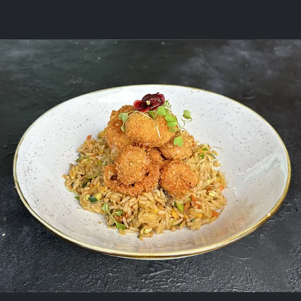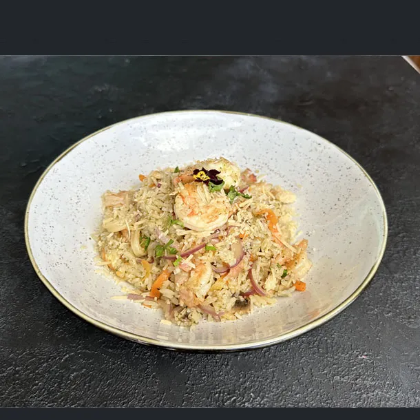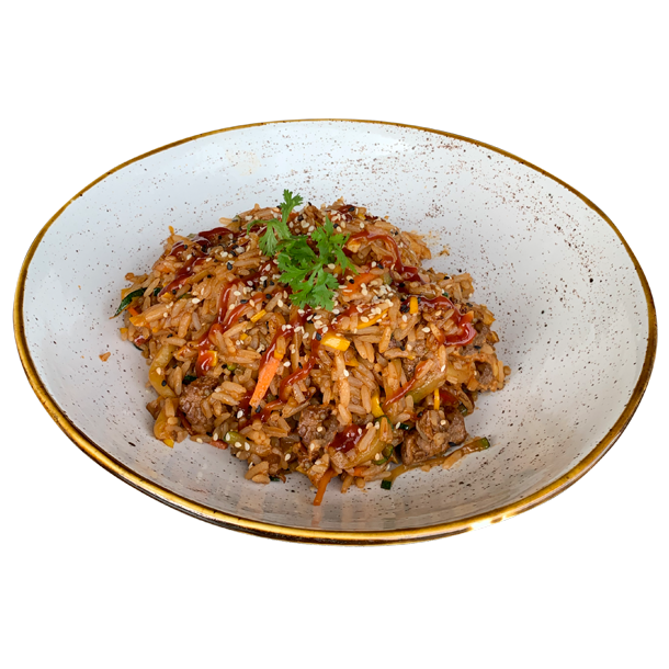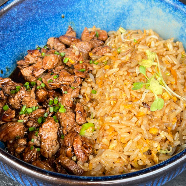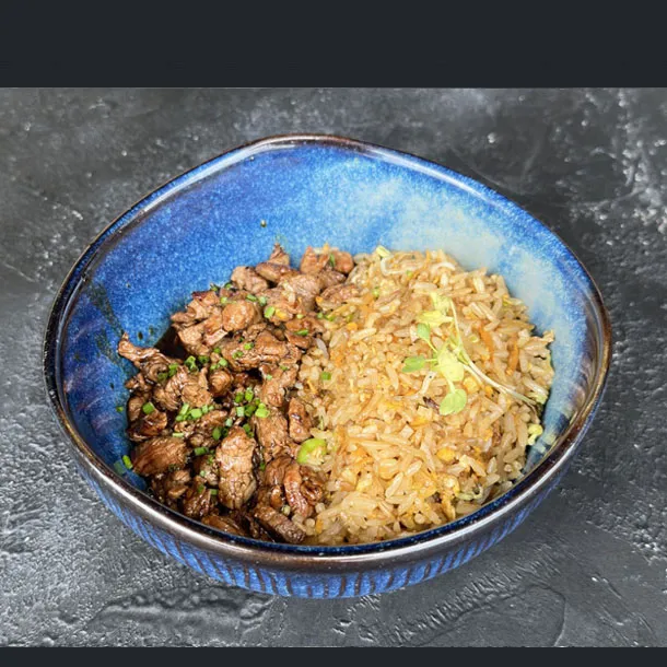 Arroz salteado con solomito de res, verduras y ajonjolí, aderezado con salsa de soya y teriyaki.