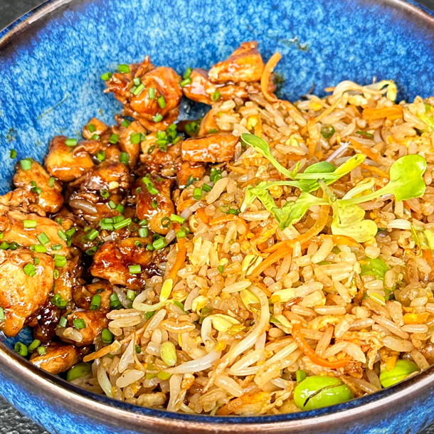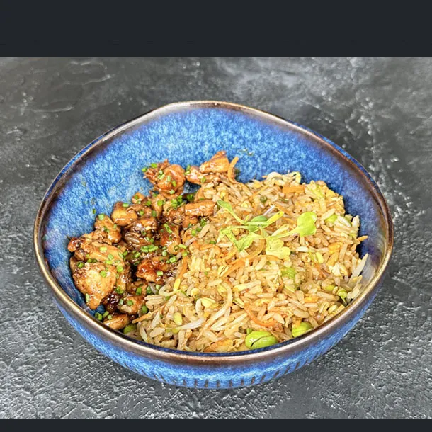 Arroz frito japonés con verduras, huevo y solomito en salsa teriyaki