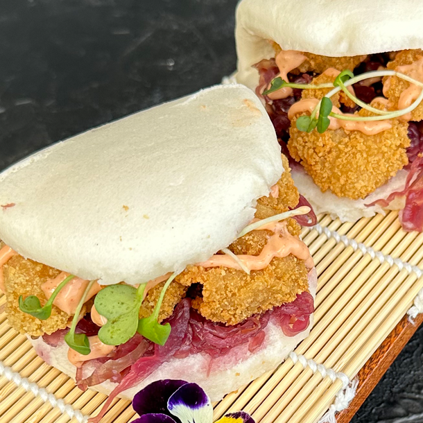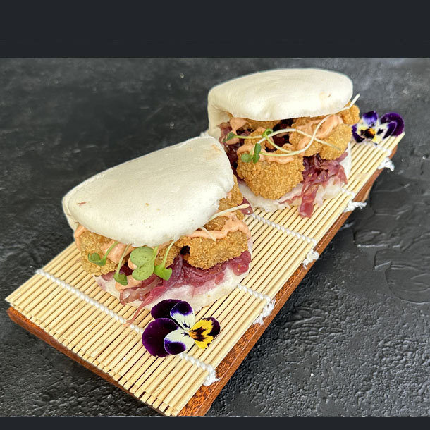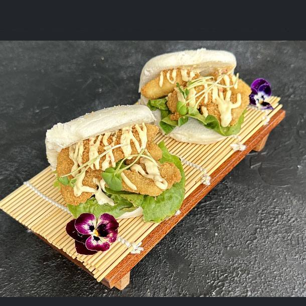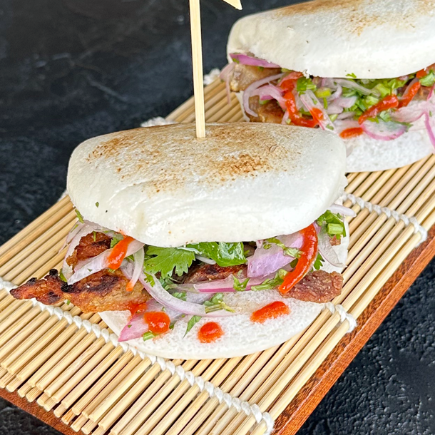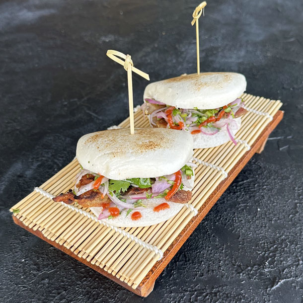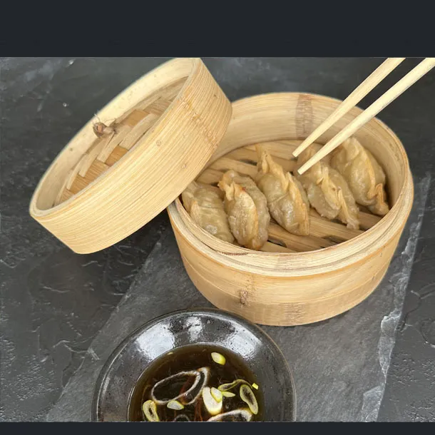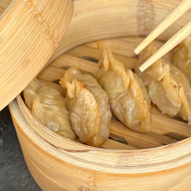 Empanadas orientales rellenas de carne de cerdo, especias y cebollín. Al vapor.