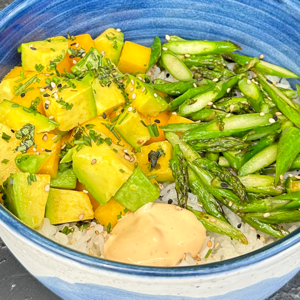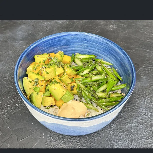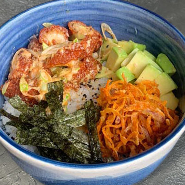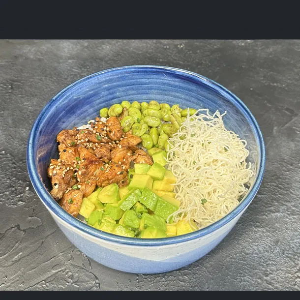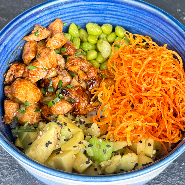 Bowl de Pollo Teriyaki, con aguacate, edamames, zanahoria crispy, sobre arroz de sushi.