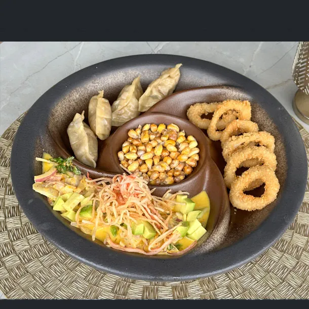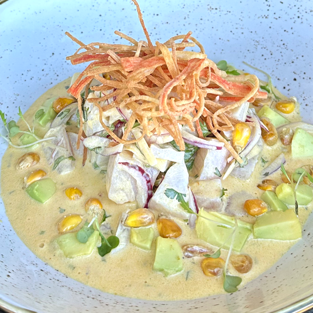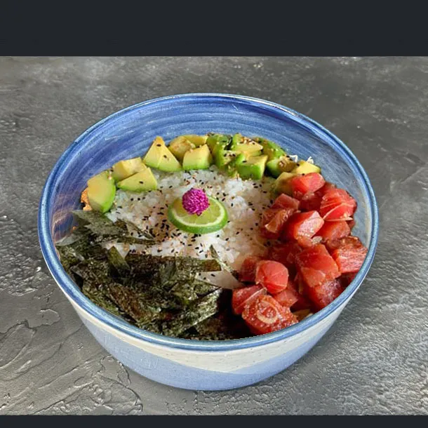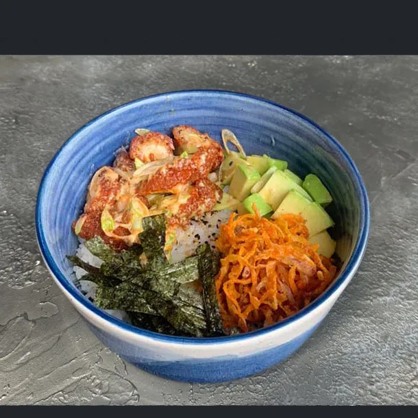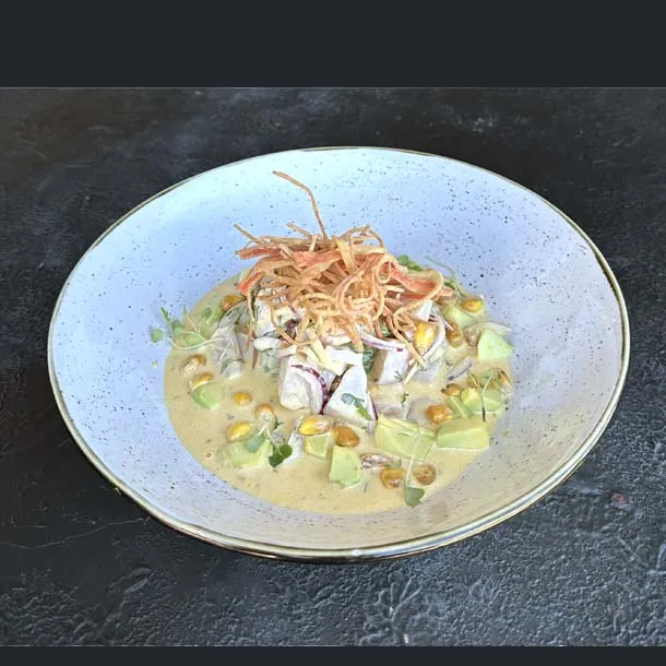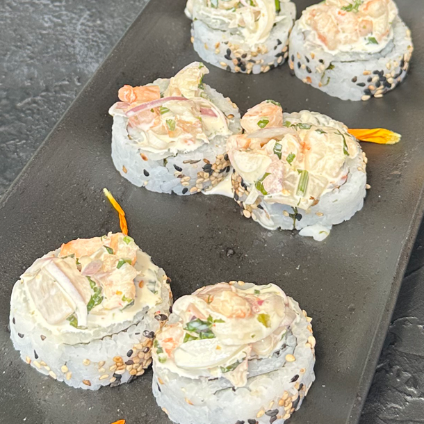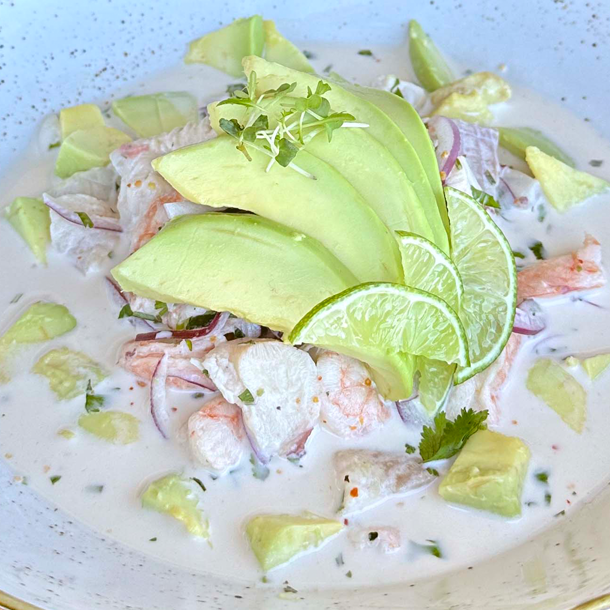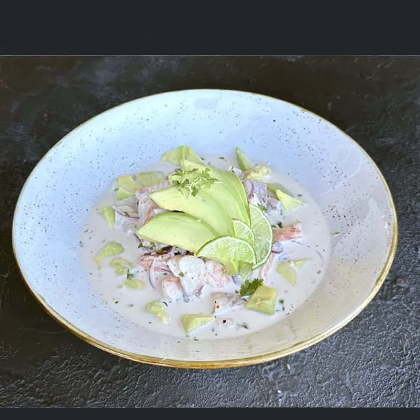 Aguacate, tilapia, langostino pre-cocido, con topping de camarones acevichados.