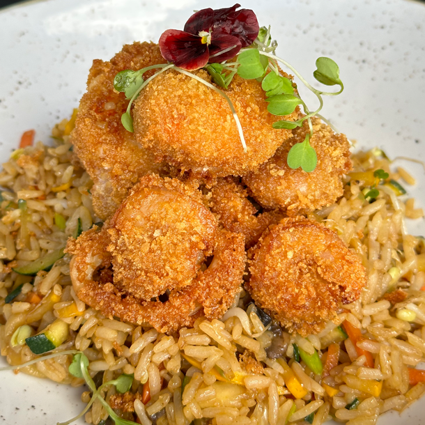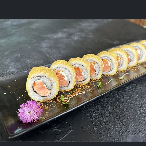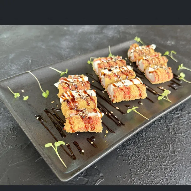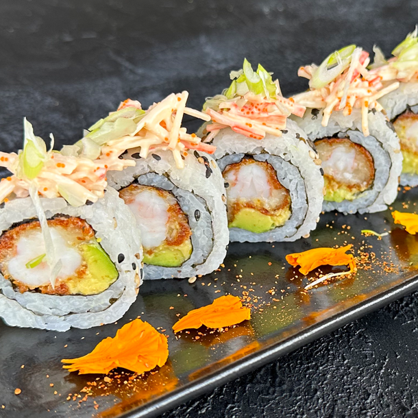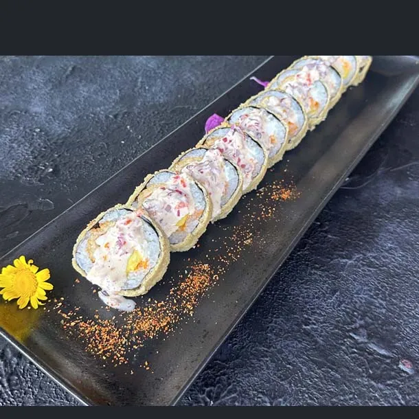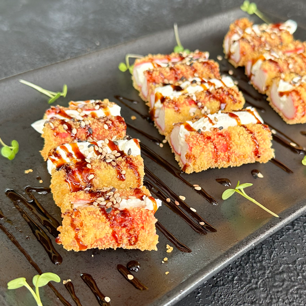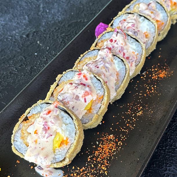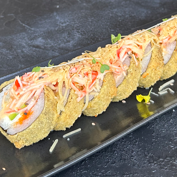masago , envuelto en panko, con topping