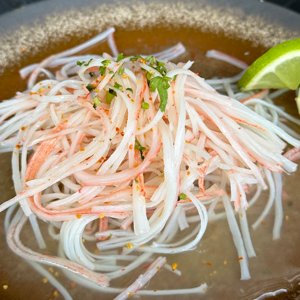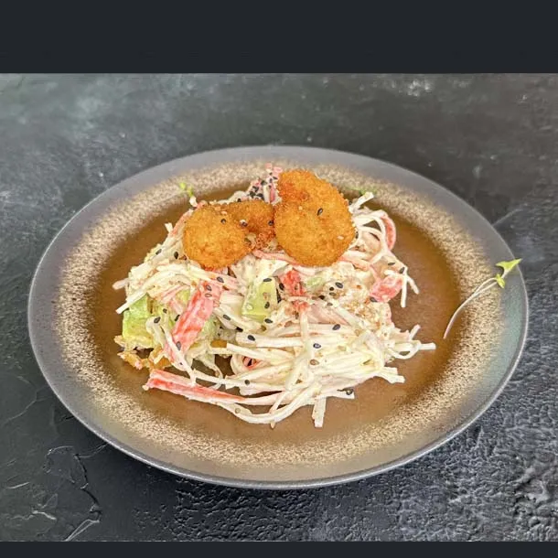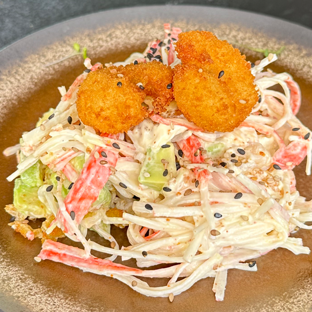 Palmito de cangrejo, aguacate y langostino,