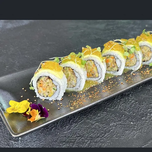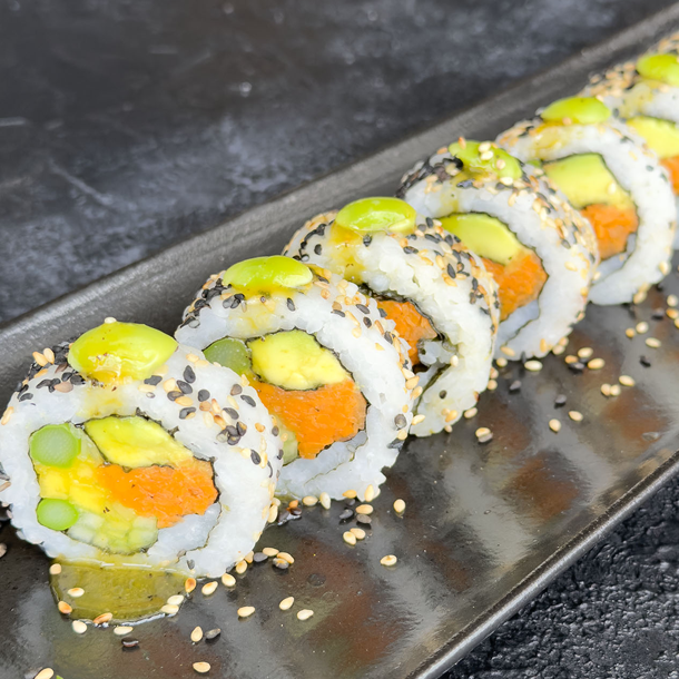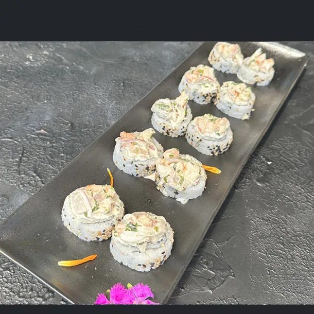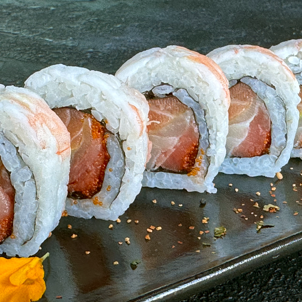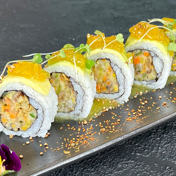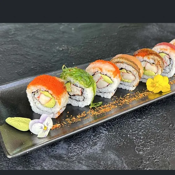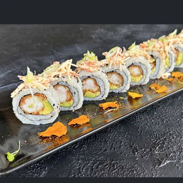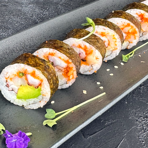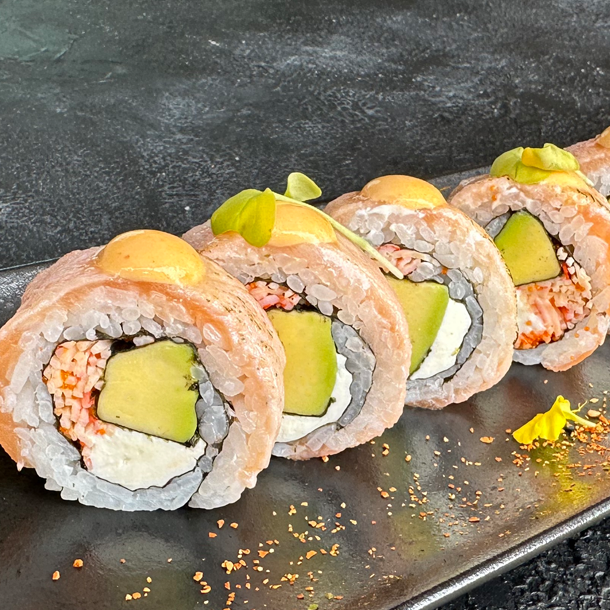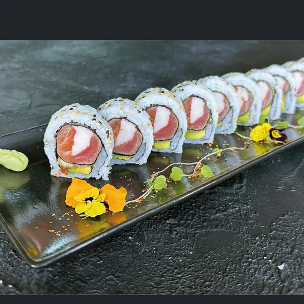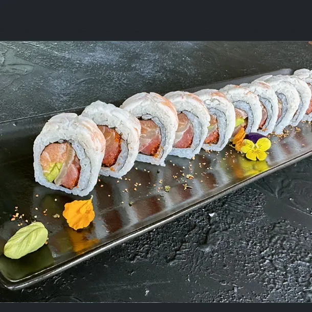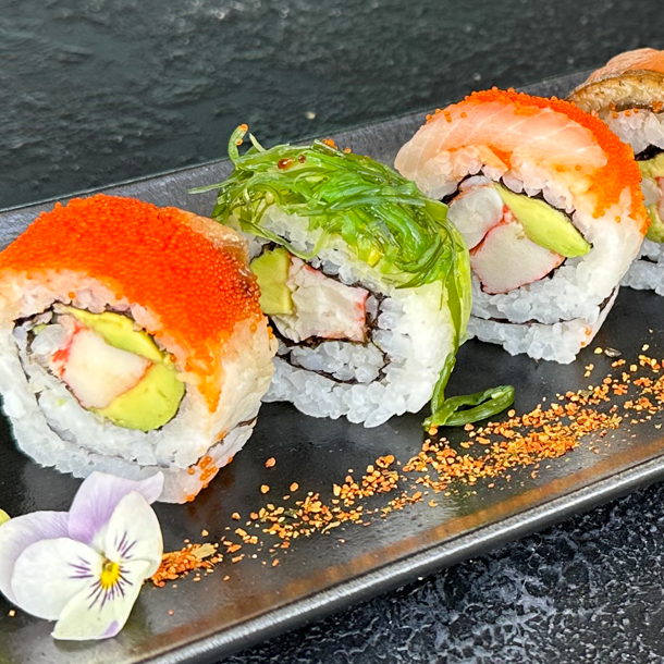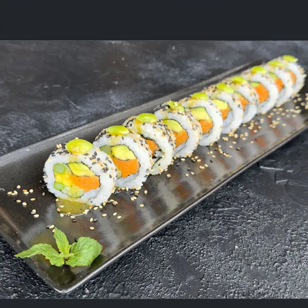 Salmón, atún, palmito de cangrejo, aguacate, envuelto en caviar de cangrejo y ajonjolí.