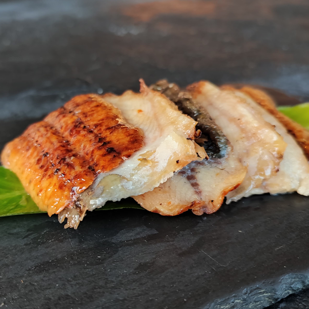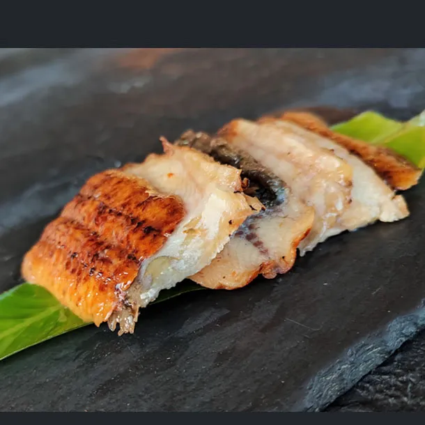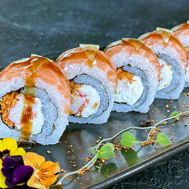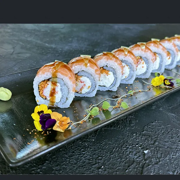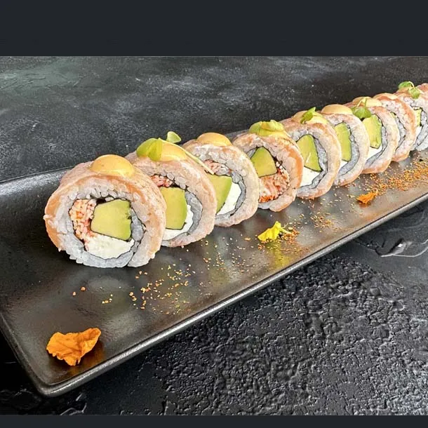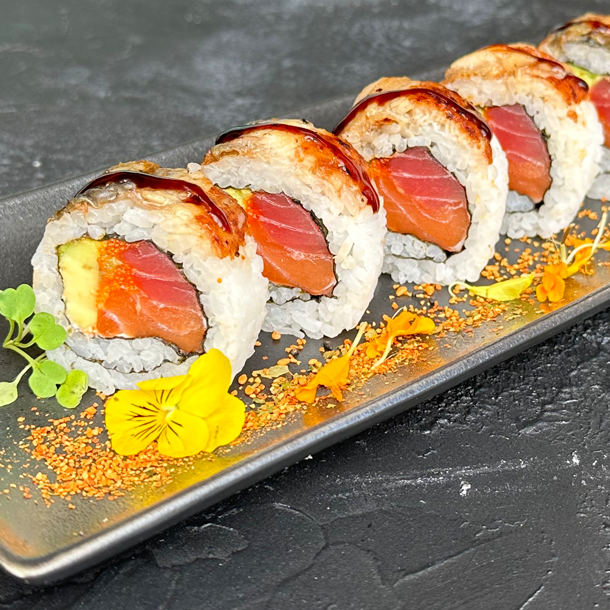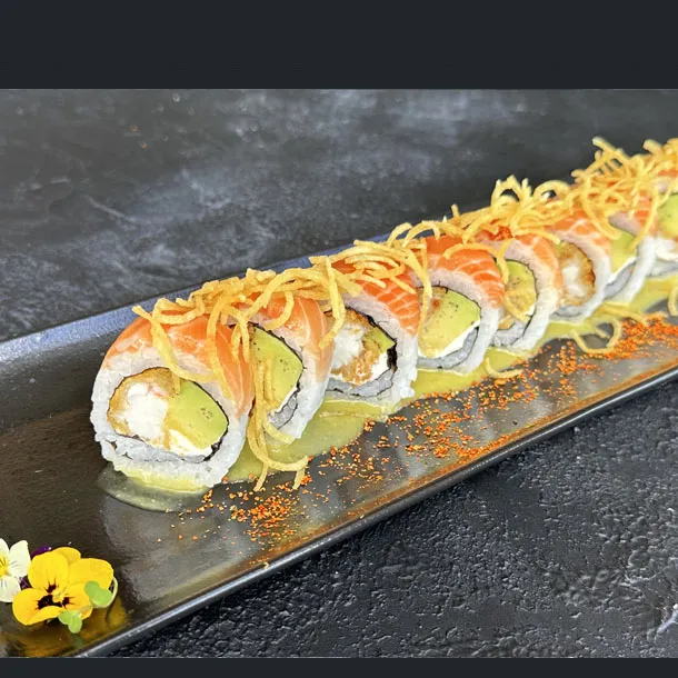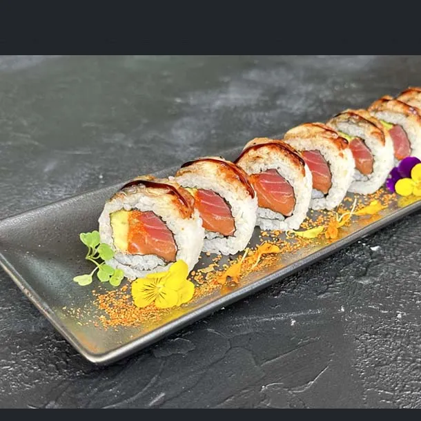 Salmón, atún, aguacate, caviar de cangrejo, queso Philadelphia, envuelto en anguila ahumada, Flameado.