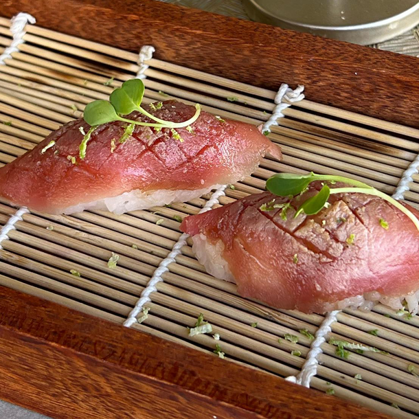 Nigiri de atún fresco, con ralladura de limón y aromatizado con aceite de trufa.