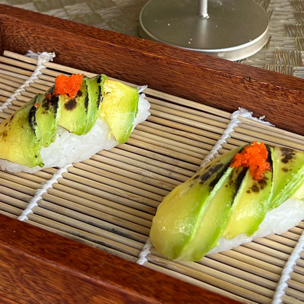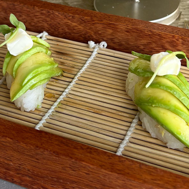aguacate, ajonjolí y nori sobre arroz de sushi.